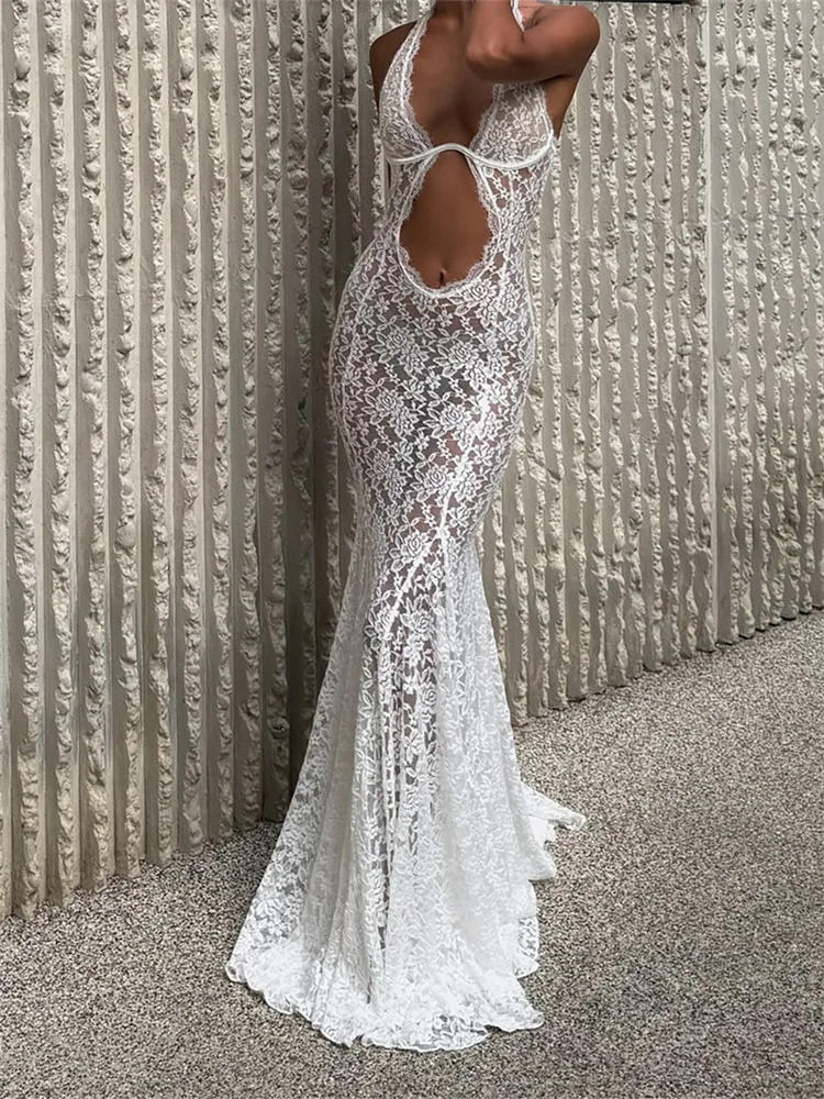 Women’s Lace Halter Dress Stylish Solid Mesh Lace Floral See Through Sleeveless Slim Fit Long Bodycon Fishtail Dress